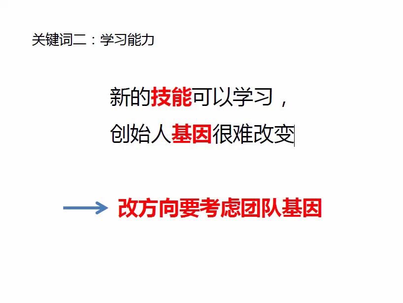在团队里面很重要的一个词叫做学习能力,好多事情现在做得不太好,不太懂的,最后用一个字我这个人学习能力特别强,一语带过了,学习能力强就解决所有的问题。原来做2B的现在也可以做2C,我们相信人定胜天,创业者只要优秀什么都能解决。这话一部分对,就说我们学习能力很重要,不熟的东西要去学,但有一样东西叫做基因,基因这个东西很难改。我们分析了之后,所谓的项目里面转型不成功的,原先做2B生意的现在转过来做2C的很难成功,就特别的辛苦。帮他们找了产品经理其实也还不行,产品经理可以把产品做出来,但是2C的思维出不来,这个改起来是非常难的。