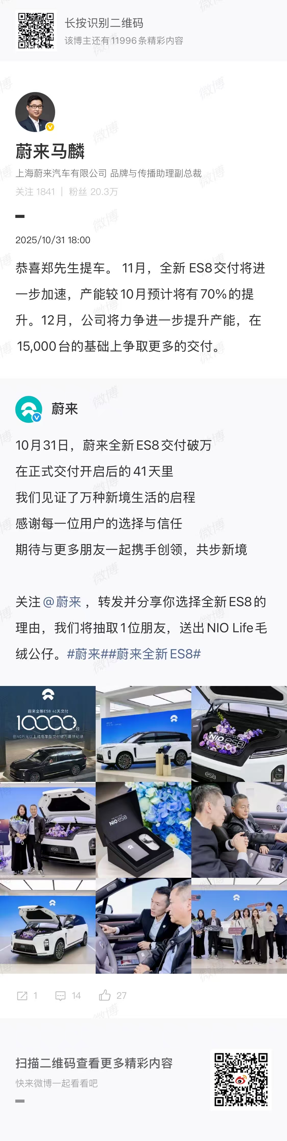 据蔚来高管在微博上透露,11月,全新 ES8 交付将进一步加速,产能较10月预计将有70%的提升。12月,公司将力争进一步提升产能,在 15,000 台的基础上争取更多的交付。